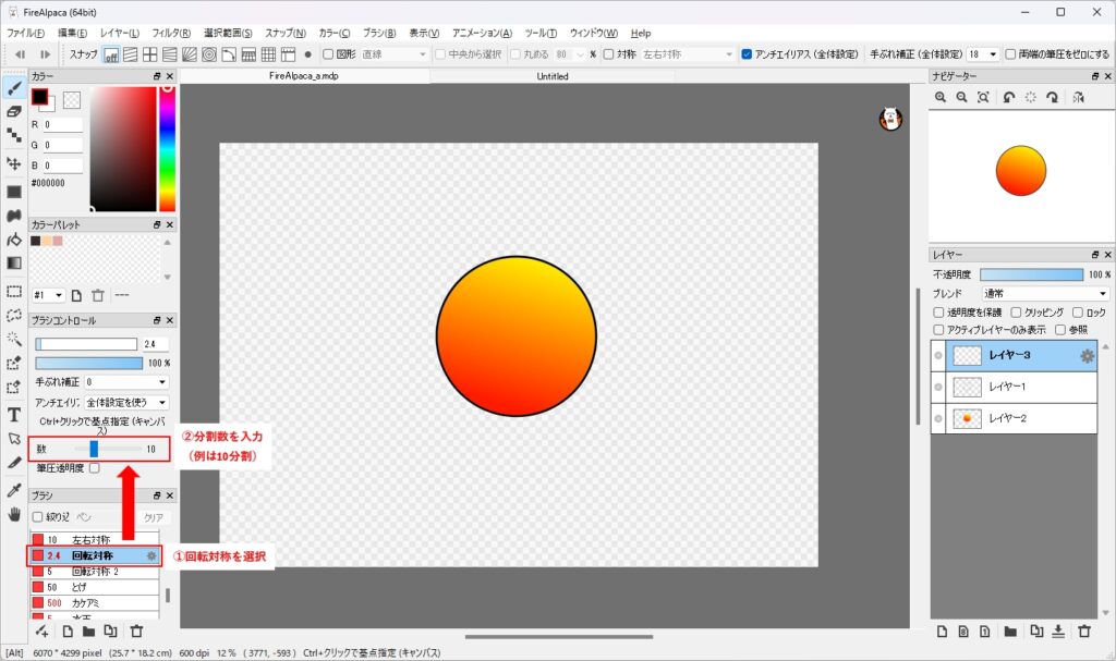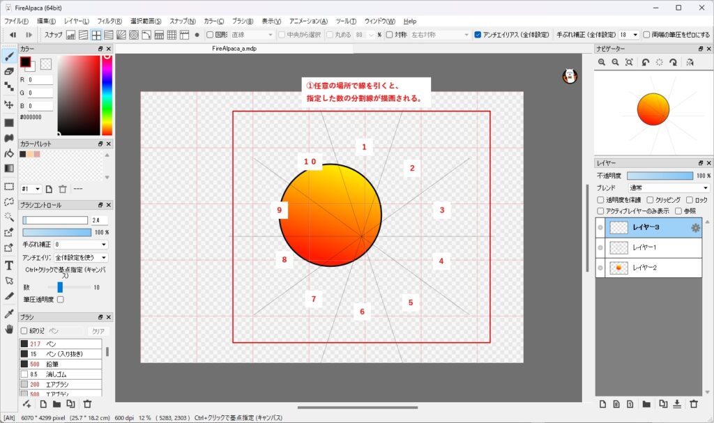 回転対称で各方位に線が描画されて、指定した数で等分されたレイヤーが出来上がりました。