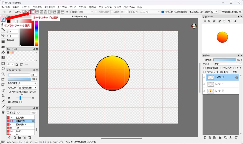 「ブラシツール」を選択して、スナップから「十字スナップ」を選択します。